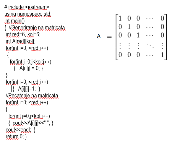 <iostream> #include <iostream> using namespace std; int main(void) { int n; cout<<"Dimenziја na kvadratnа matricа --->"; cin>>n; int iMatrica[n][n]; for(int i=0; i < n; i++) { for(int j=0; j < n; j++) { cout<<"iMatrica ["<<i<<","<<j<<"] ---> "; cin>>iMatrica[i][j]; } } cout<<endl; for(int i=0; i < n; i++) { for(int j=0; j < n; j++) { if(i>j) { cout<<iMatrica[i][j]<<" "; } else cout<<" "; } cout<<endl; } return 0; } Да се состави потпрограма со која ќе се најде транспонираната матрица на матрицата А. Tранспонирана матрица се добива кога ќе се направи замена на редиците со колоните,односно транспонираната матрица B[i][j] = A[j][i] #include